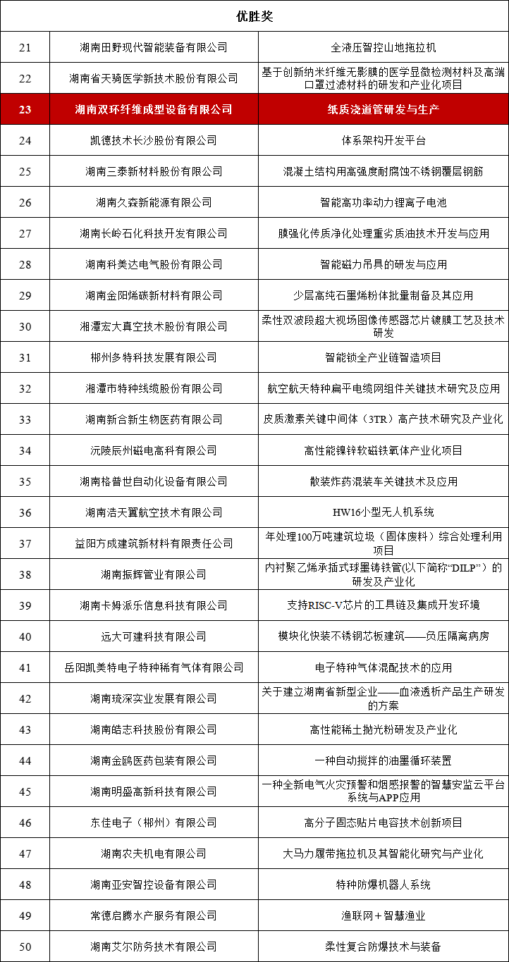 近日,湖南省工信廳公布了2020年“創(chuàng)客中國”湖南省中小微企業(yè)創(chuàng)新創(chuàng)業(yè)大賽決賽獲獎項目,湘潭高新區(qū)企業(yè)湖南雙環(huán)纖維成型設備有限公司的“紙質澆道管研發(fā)與生產(chǎn)”項目榮獲企業(yè)組優(yōu)勝獎。
